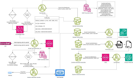 - AWS S3, Lambda, SQS, EventBridge, SSM Parameter Store: Ці сервіси використовувалися для побудови надійної, масштабованої та повністю автоматизованої архітектури, яка дозволяє: Завантажувати записи дзвінків із Binotel по API. Обробляти їх по черзі. Зберігати дані та результати аналізу. Керувати процесом обробки через конфігураційний файл.